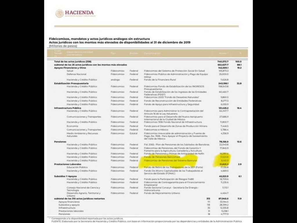 El documento de Hacienda correspondiente al cierre de 2019 muestra claramente que el Fideicomiso de Pensiones del Sistema Banrural formaba parte de los 25 actos jurídicos con mayores disponibilidades, con un monto de 13,626.8 millones de pesos. Sin embargo, en los informes más recientes, el fideicomiso fue eliminado de la lista, lo que ha generado alarma entre los pensionados y jubilados del extinto Banco Nacional de Crédito Rural.