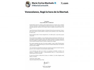 La dirigente opositora María Corina Machado emitió este viernes un mensaje contundente al pueblo venezolano, en el que aseguró que “llegó la hora de la libertad” y llamó a iniciar una transición democrática tras años de crisis política y autoritarismo.
