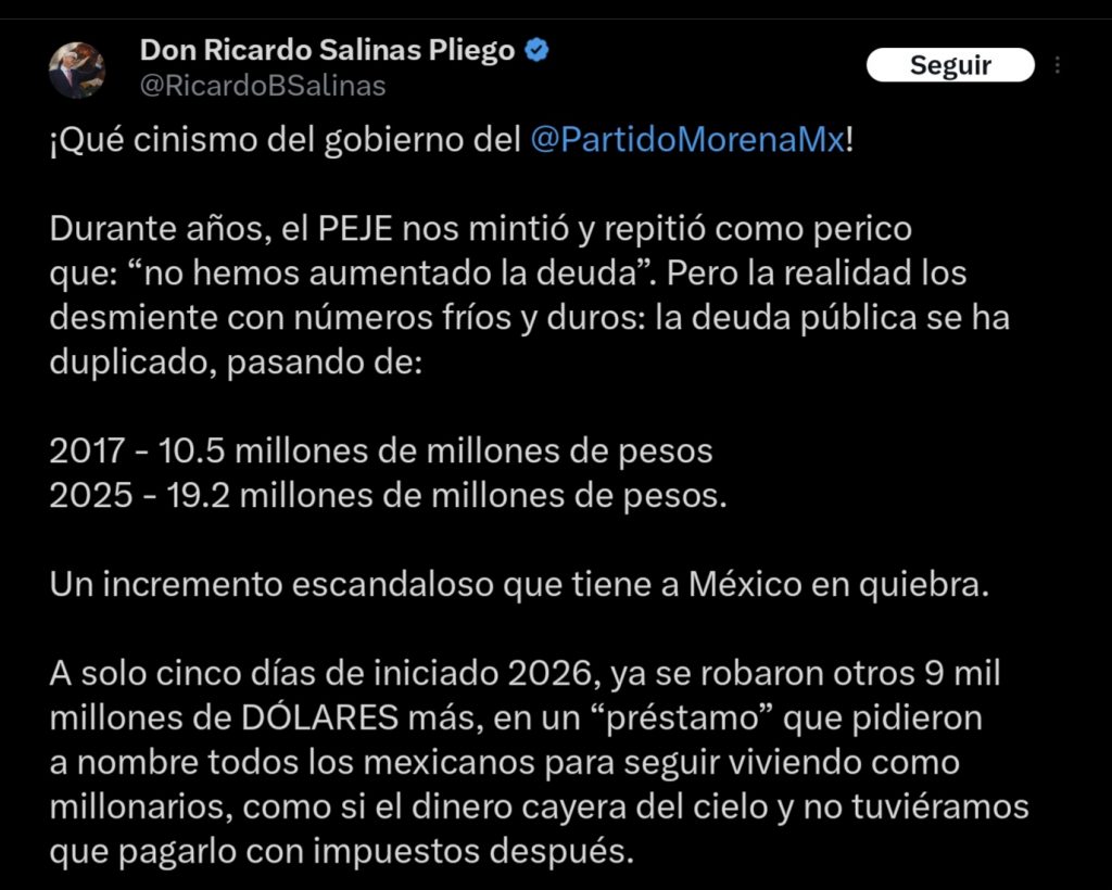 El dueño de Grupo Salinas también denunció que a solo cinco días de iniciado 2026 el gobierno habría contratado un nuevo endeudamiento por 9 mil millones de dólares, el cual —afirmó— compromete a todos los mexicanos para sostener el gasto gubernamental.