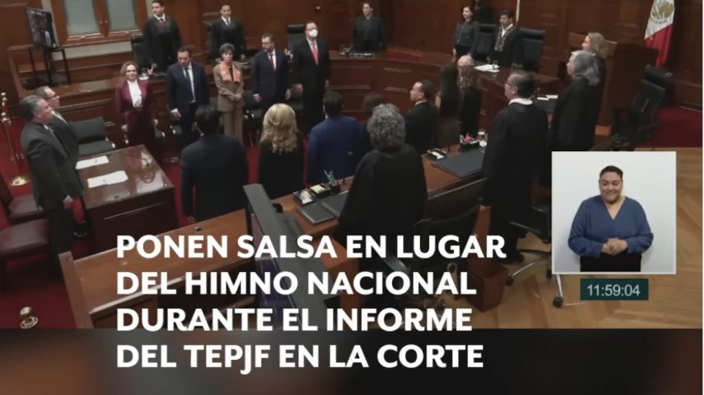 El incidente ocurrió justo al finalizar el discurso de la magistrada presidenta del TEPJF, Mónica Soto Fregoso, quien presentó su último informe de labores. Al solicitar a los asistentes ponerse de pie para entonar el himno, se escuchó la introducción de la popular salsa, lo que provocó sorpresa entre los presentes.