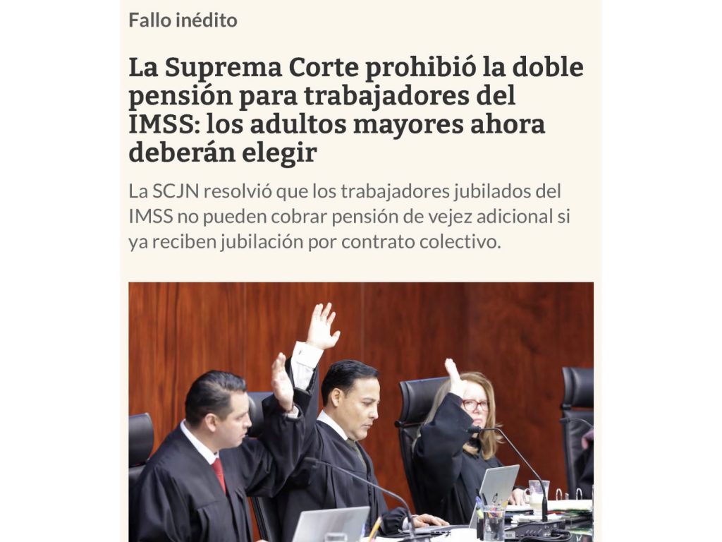 La Suprema Corte de Justicia de la Nación (SCJN) resolvió que los trabajadores jubilados del Instituto Mexicano del Seguro Social (IMSS) no pueden cobrar de manera simultánea dos pensiones, por lo que deberán elegir entre la pensión derivada del contrato colectivo de trabajo o la pensión por vejez.