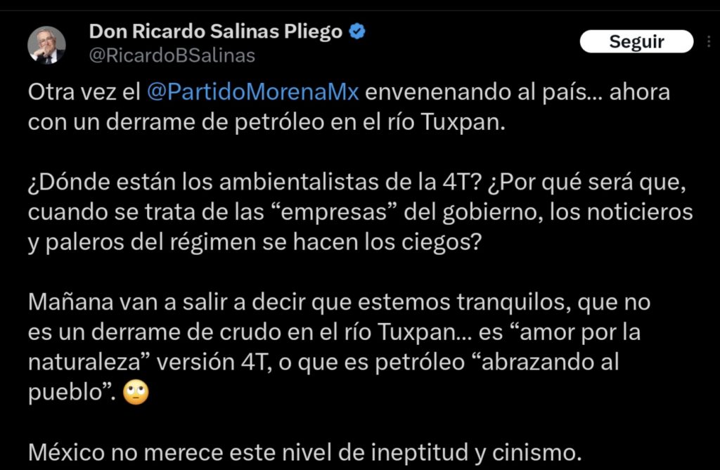 Salinas Pliego advirtió que en los próximos días podrían minimizar el incidente, diciendo que no se trata de un derrames de crudo, sino de una especie de “amor por la naturaleza” versión 4T, o incluso de petróleo “abrazando al pueblo”, criticando la postura del gobierno por su ineptitud y cinismo.
