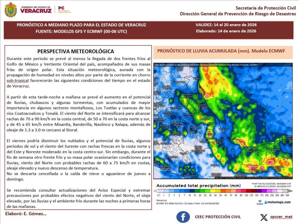 La Secretaría de Protección Civil de Veracruz emitió un pronóstico a mediano plazo en el que advierte la llegada de al menos dos frentes fríos al Golfo de México y la vertiente oriental del país, lo que provocará lluvias, tormentas, fuertes vientos del Norte y descenso de temperatura en gran parte del estado.