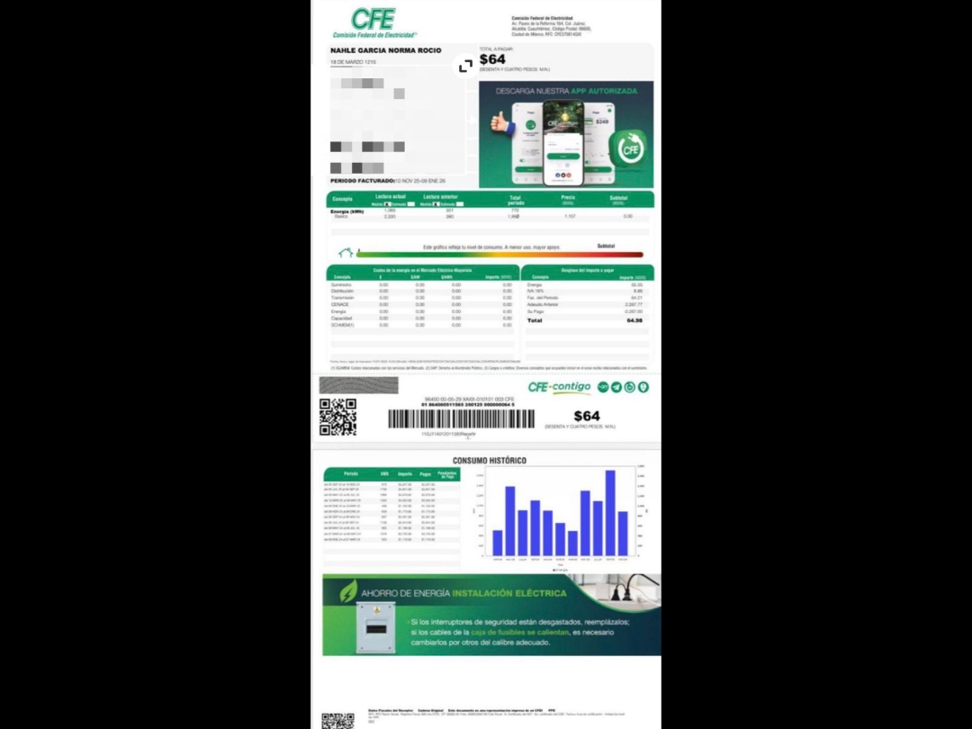 De acuerdo con las publicaciones, el inmueble habría registrado anteriormente consumos bimestrales que oscilaban entre los 1,100 y 4,800 pesos, mientras que en el recibo difundido recientemente el pago sería únicamente de 64 pesos.