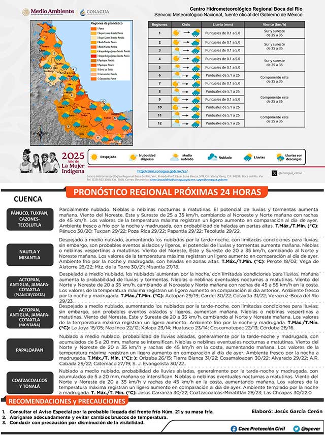 En territorio veracruzano, las lluvias se presentarán de manera aislada, con mayor probabilidad en las cuencas del sur, donde se esperan acumulados de entre 5 y 20 milímetros.
