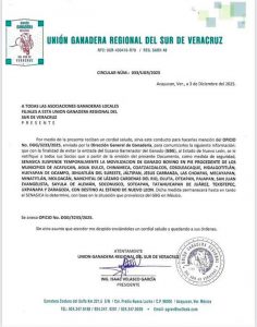 El aviso fue firmado por el presidente de la Unión Ganadera Regional del Sur de Veracruz, Ing. Isaac Velasco García, quien pidió a los socios mantenerse informados y acatar las disposiciones federales.