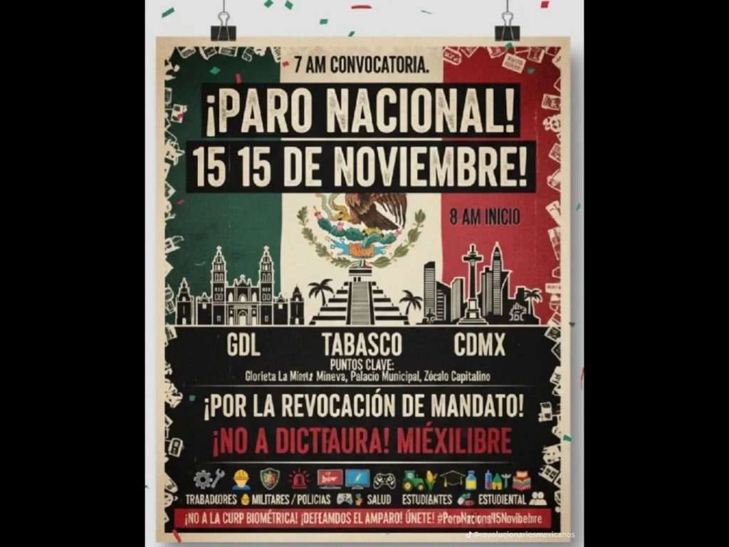 La movilización se presenta como una protesta “por la defensa del amparo y contra la CURP biométrica”, bajo la consigna #ParoNacional15Noviembre.