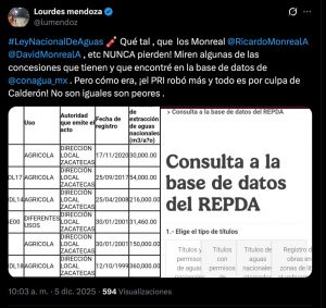 En redes sociales se viralizó una denuncia donde se señala que la familia Monreal, incluyendo a Ricardo Monreal y David Monreal, habría acumulado múltiples concesiones de agua, según registros obtenidos de la base de datos de la Conagua.