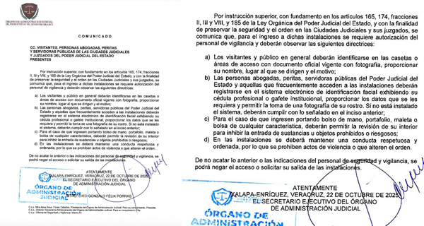 El Órgano de Administración Judicial del Poder Judicial del Estado de Veracruz anunció el pasado 22 de octubre la creación de un sistema biométrico para controlar el acceso y salida de instalaciones y verificar la identidad de abogados, personas usuarias y trabajadores del Poder Judicial.