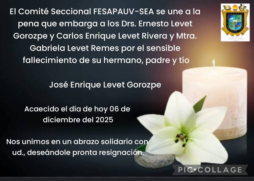 La tarde de este sábado, victima de un infarto falleció José Enrique Levet Gorozpe, conocido como “El Papo” Levet, secretario general del Sindicato del Personal Académico de la Universidad Veracruzana (FESAPAUV), según confirmaron académicos agremiados.