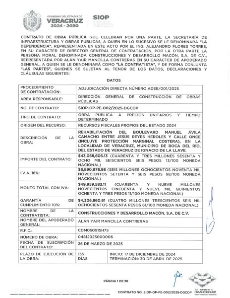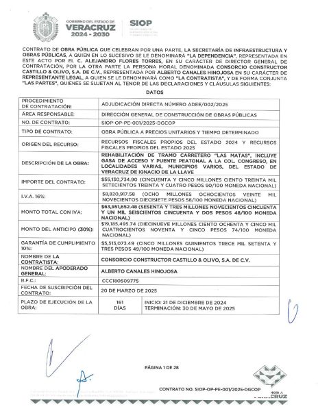 Entre las obras heredadas de la gestión anterior destacan la rehabilitación del tramo carretero “Las Matas” en Coatzacoalcos–Minatitlán, a cargo de Consorcio Constructor Castillo & Olivo, y la remodelación del bulevar Manuel Ávila Camacho, en Veracruz–Boca del Río, asignada a Construcciones y Desarrollo Macon, ambas por adjudicación directa y con rezagos importantes en su ejecución.