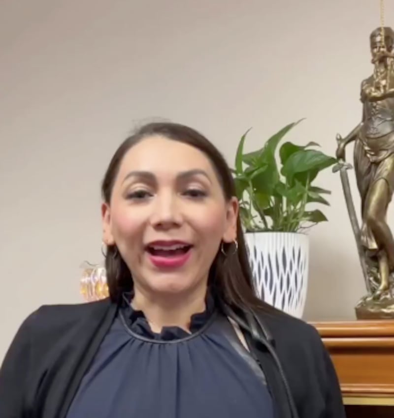 Karina Villeda mira a la cámara, con los labios pintados de roio y un semblante tranquilo. Detrás de ella hay una escultura de la justicia. Los subtitulos del video tienen una marca de agua que los hace parecer más relajados.De fondo, , música suave. Villeda pregunta:»‘Has sentido que eres injusta contigo misma? Nos pasa a muchas, porque crecimos creyendo que debíamos callar, complacer y aguantar más de lo iusto».