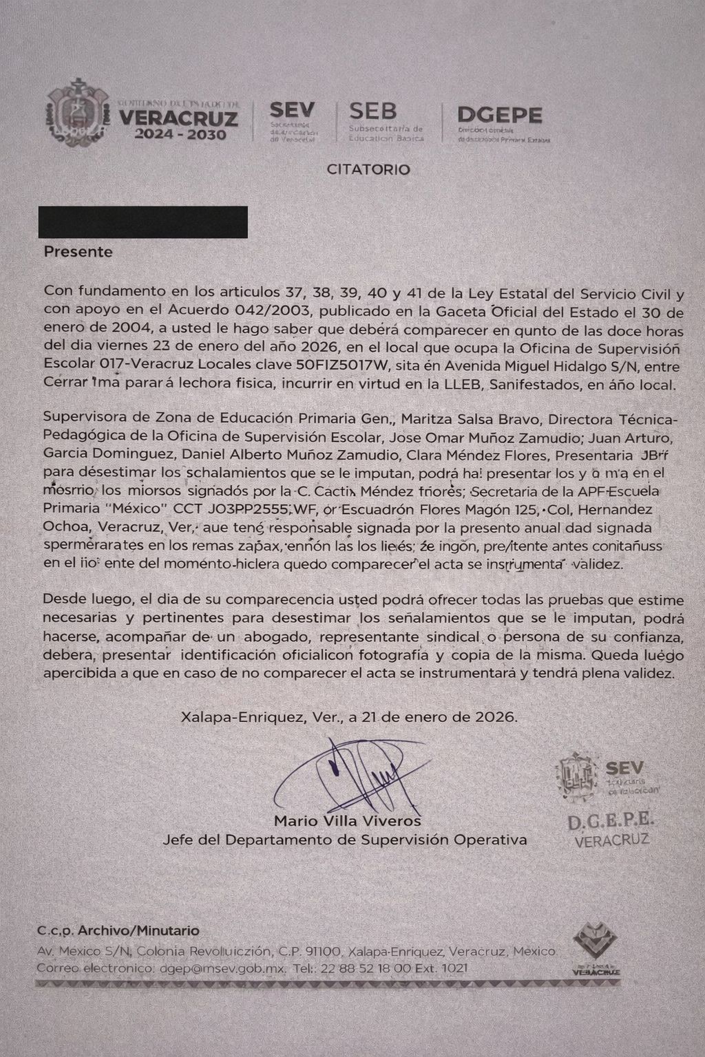 Esa protección tiene nombre y cargo: Christopher Couttolenc Ochoa, Director General de Educación Primaria Estatal de la SEV. Desde ese puesto —con control directo sobre la estructura de primaria— intervino para fabricar un procedimiento administrativo inexistente en mi contra. Lo hizo firmando el Oficio de Comisión SEV/SUB-EB/DGEPE/208/2026, con el que habilitó a un tercero para levantar una supuesta acta circunstanciada fraudulenta e indebida, carente de sustento legal.