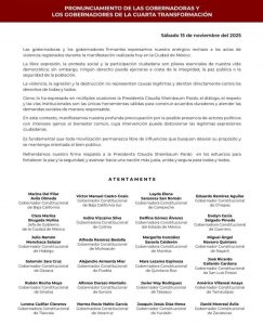Mientras el país observaba cómo la presidenta utilizaba a su bloque negro para montar una narrativa de violencia fabricada, los gobernadores de Morena se apresuraron a firmar un pronunciamiento que buscaba dotar de legitimidad lo que es, en el fondo, una operación política profundamente deshonesta. El comunicado, redactado con un lenguaje burocrático y una solemnidad falsa, pretende condenar la violencia sin mencionar la responsabilidad del propio gobierno en producirla.