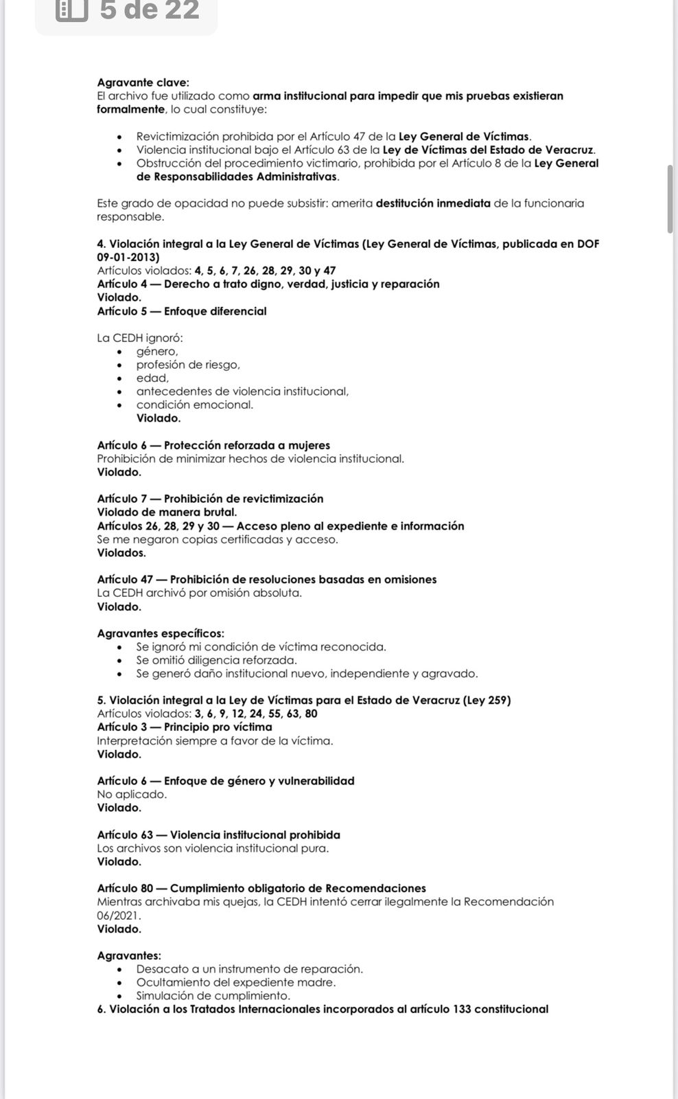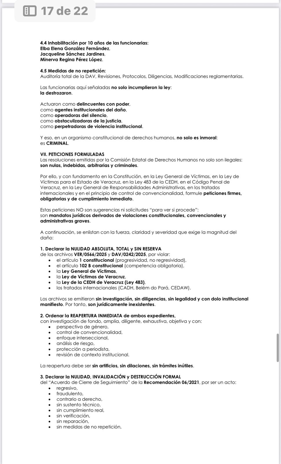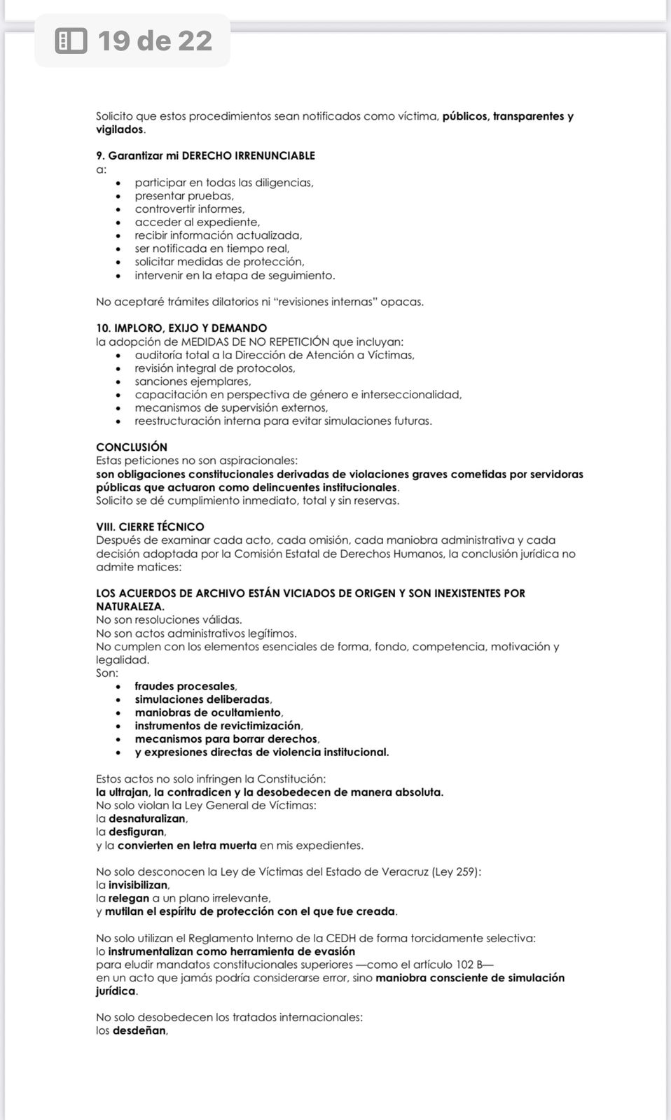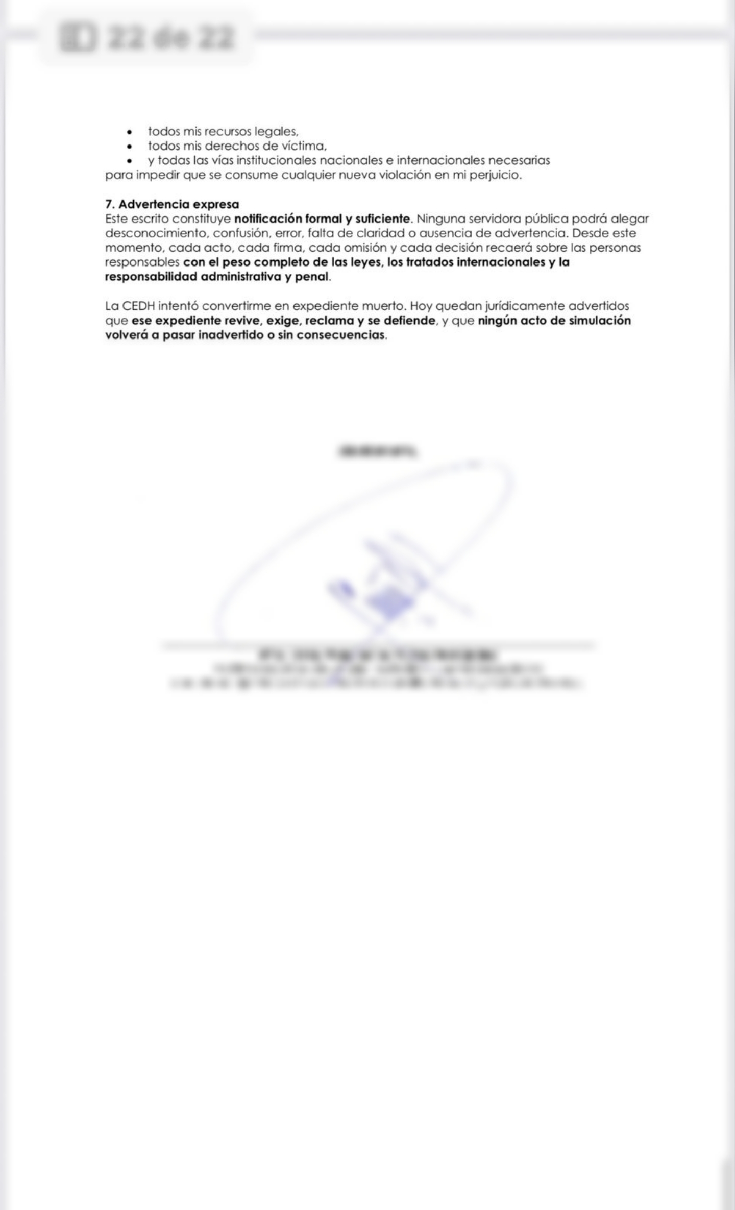 No hubo reparación, no hubo medidas de no repetición, no hubo sanciones, no hubo verificación ni seguimiento, y no existe un solo acto jurídico que permita su cierre. Lo que se intentó fue borrar todas las rutas legales que documentan la violencia institucional ejercida en mi contra desde 2019, mediante maniobras administrativas que violan la Constitución, la Ley de Víctimas y los tratados internacionales.