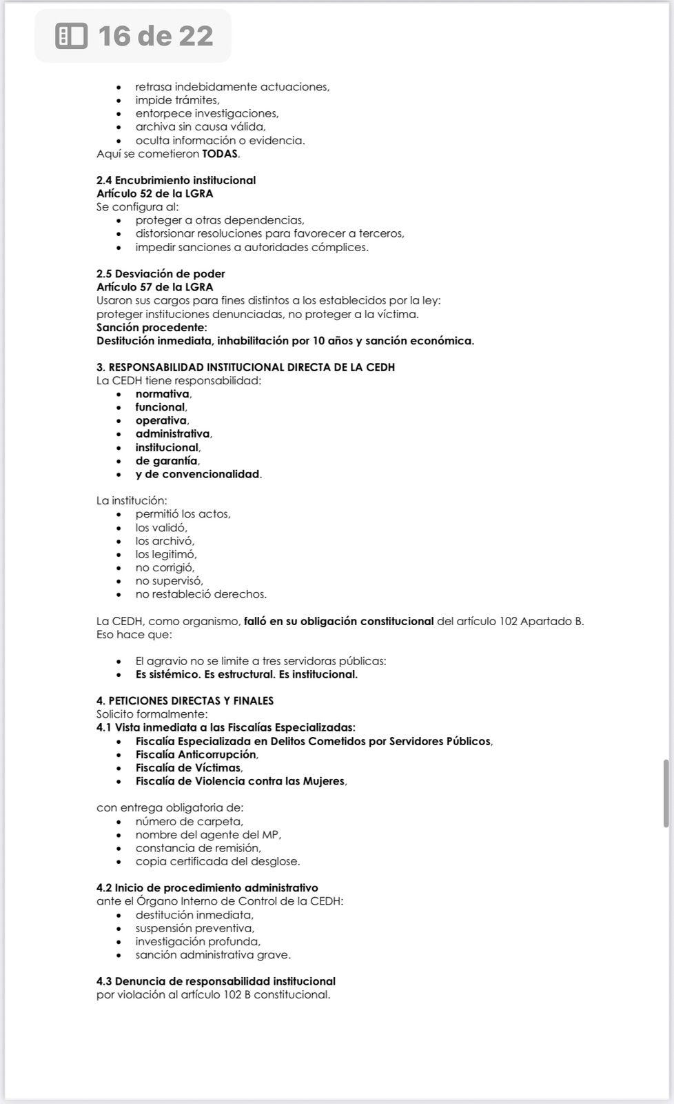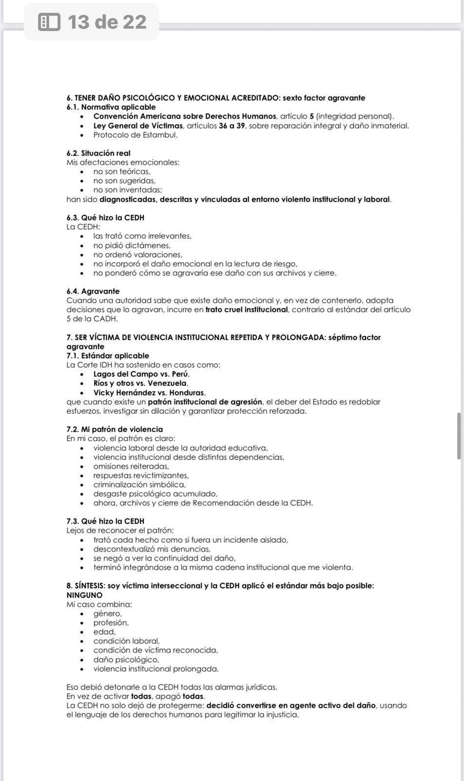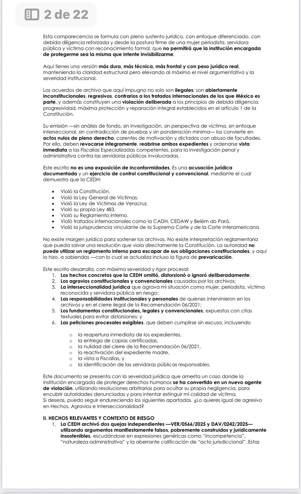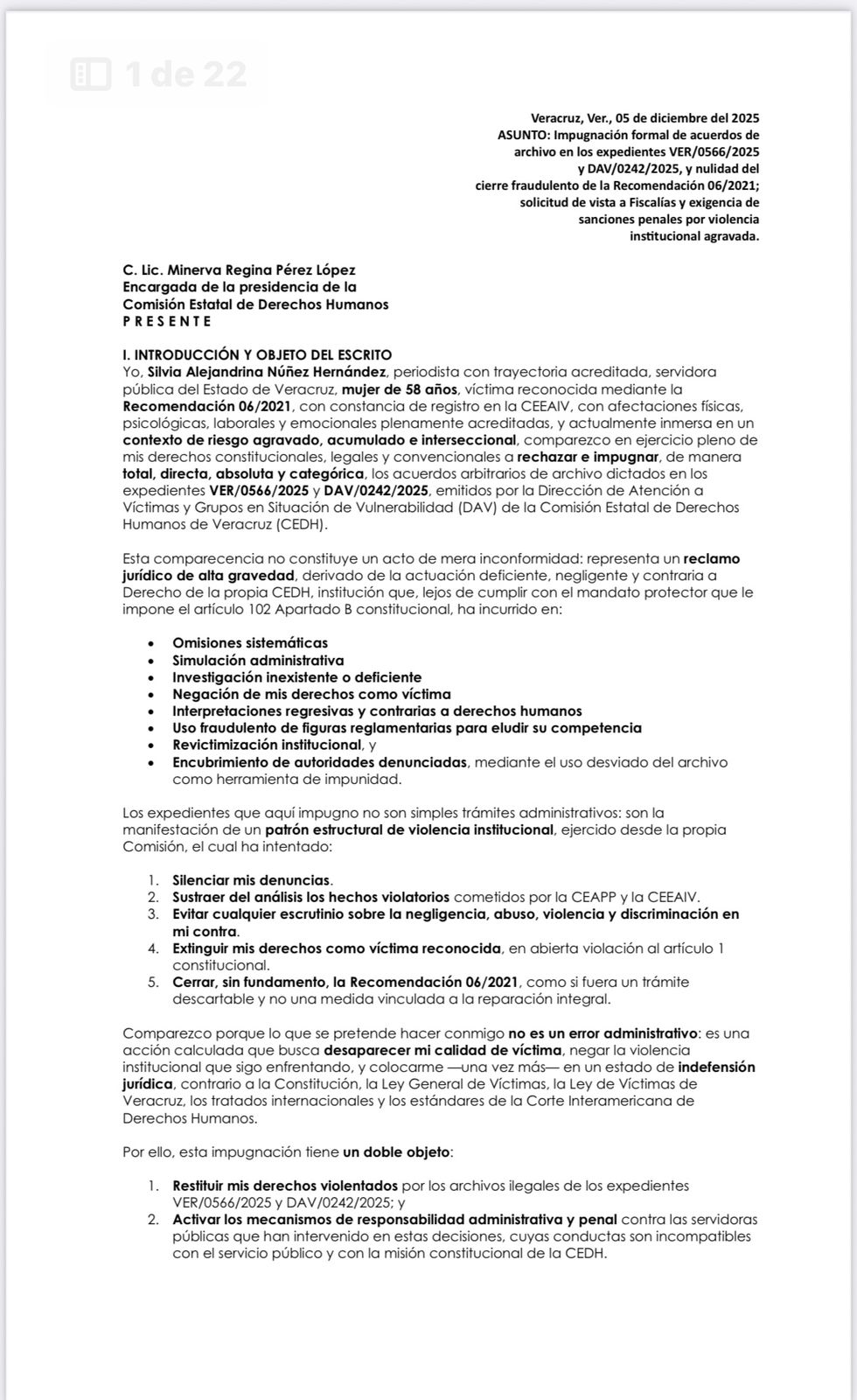 No hubo reparación, no hubo medidas de no repetición, no hubo sanciones, no hubo verificación ni seguimiento, y no existe un solo acto jurídico que permita su cierre. Lo que se intentó fue borrar todas las rutas legales que documentan la violencia institucional ejercida en mi contra desde 2019, mediante maniobras administrativas que violan la Constitución, la Ley de Víctimas y los tratados internacionales.