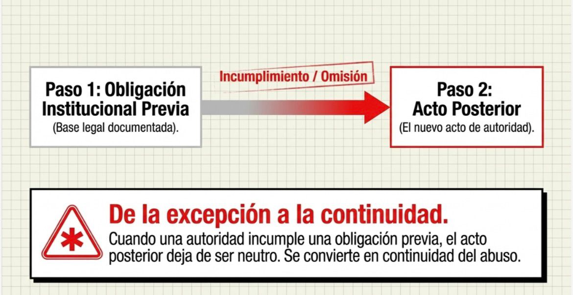 Y bajo esa lógica, hay una regla que resulta determinante y que desarma por completo cualquier intento de defensa institucional: cuando una autoridad incumple una obligación previa, cualquier acto posterior queda inevitablemente marcado por ese incumplimiento. No puede analizarse de forma aislada, como si surgiera en condiciones de legalidad, porque no es así. El acto posterior no corrige, no repara ni neutraliza; continúa. Se vuelve parte de una cadena en la que cada decisión se sostiene en la ilegalidad de la anterior.