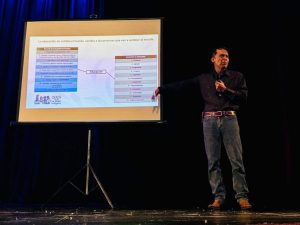 Desde esa premisa, lo ocurrido en octubre de 2025 en Veracruz no puede leerse como una simple conferencia pedagógica organizada con buena intención. Fue un acto institucional convocado desde la estructura oficial de la Supervisión Escolar Zona 017, con presencia de autoridades educativas, docentes movilizados bajo jerarquía administrativa y un escenario formal que, en teoría, debía estar al servicio de la formación profesional. Sin embargo, el desarrollo del evento mostró otra cosa: el escenario se convirtió en plataforma para que Marx Arriaga se conectara durante más de media hora a una entrevista externa, mientras las maestras y maestros permanecían en el auditorio como audiencia cautiva. Eso no es intercambio académico horizontal ni diálogo pedagógico plural; es utilización de estructura pública para proyectar una figura y sostener una narrativa.