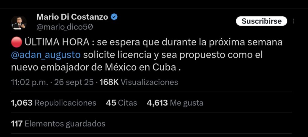 En redes sociales comenzó a circular la versión de que Adán Augusto López Hernández, exsecretario de Gobernación, solicitaría licencia la próxima semana para ser designado como embajador de México en Cuba.