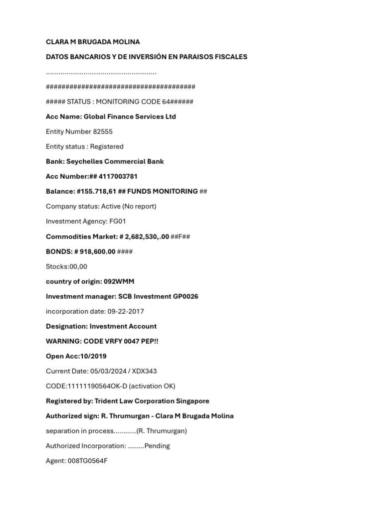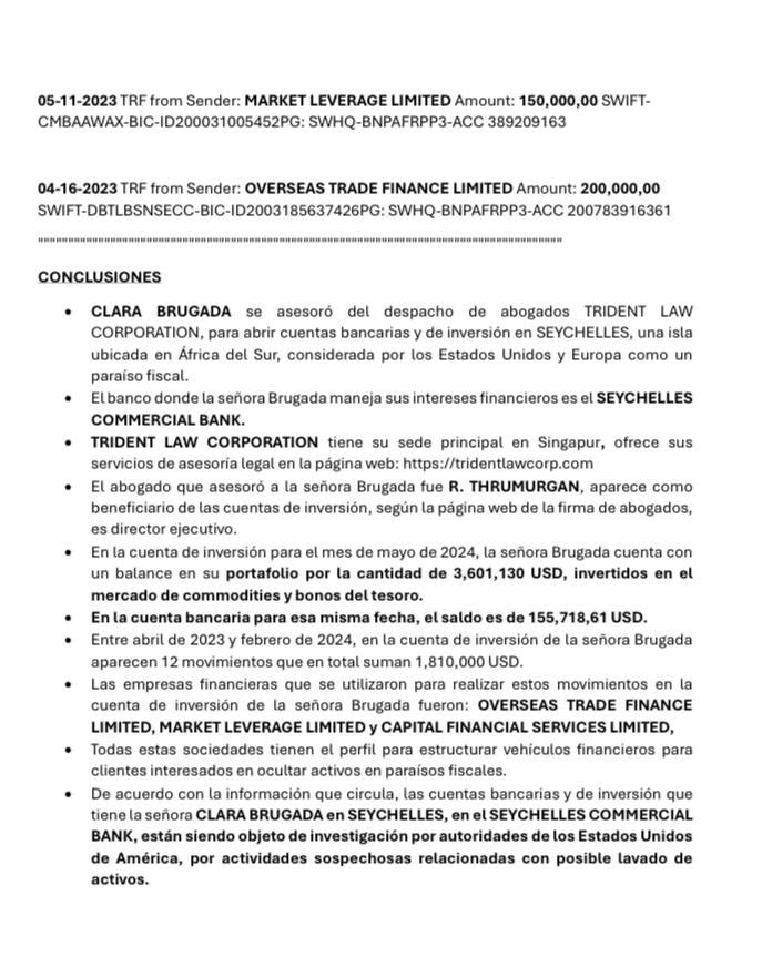 Según la denuncia pública, Brugada habría contratado al despacho internacional Trident Law Corporation, con sede en Singapur, para asesorarla en materia financiera. Castagné afirmó que los fondos estarían resguardados fuera del país mediante estructuras fiscales opacas.