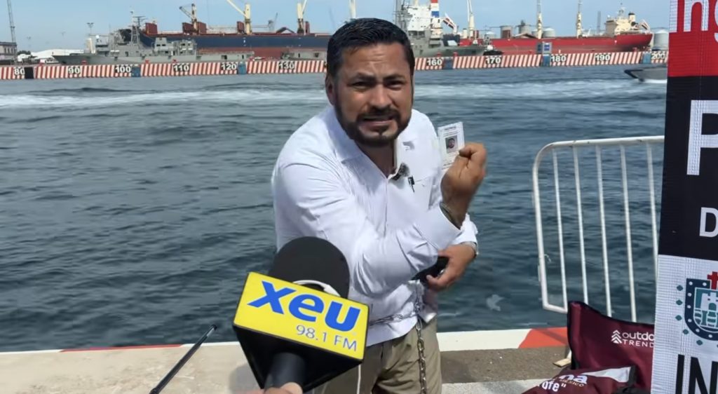 Un día antes de la visita de la presidenta Claudia Sheinbaum a Veracruz, un maestro se encadenó en un poste del malecón y comenzó una huelga de hambre para reclamar el pago de su seguro institucional de invalidez.