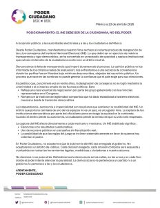 La organización Poder Ciudadano MX x MX emitió un posicionamiento público en el que rechaza el reciente proceso de designación de consejeras y consejeros del Instituto Nacional Electoral (INE), al considerar que estuvo marcado por opacidad y falta de consenso político.
