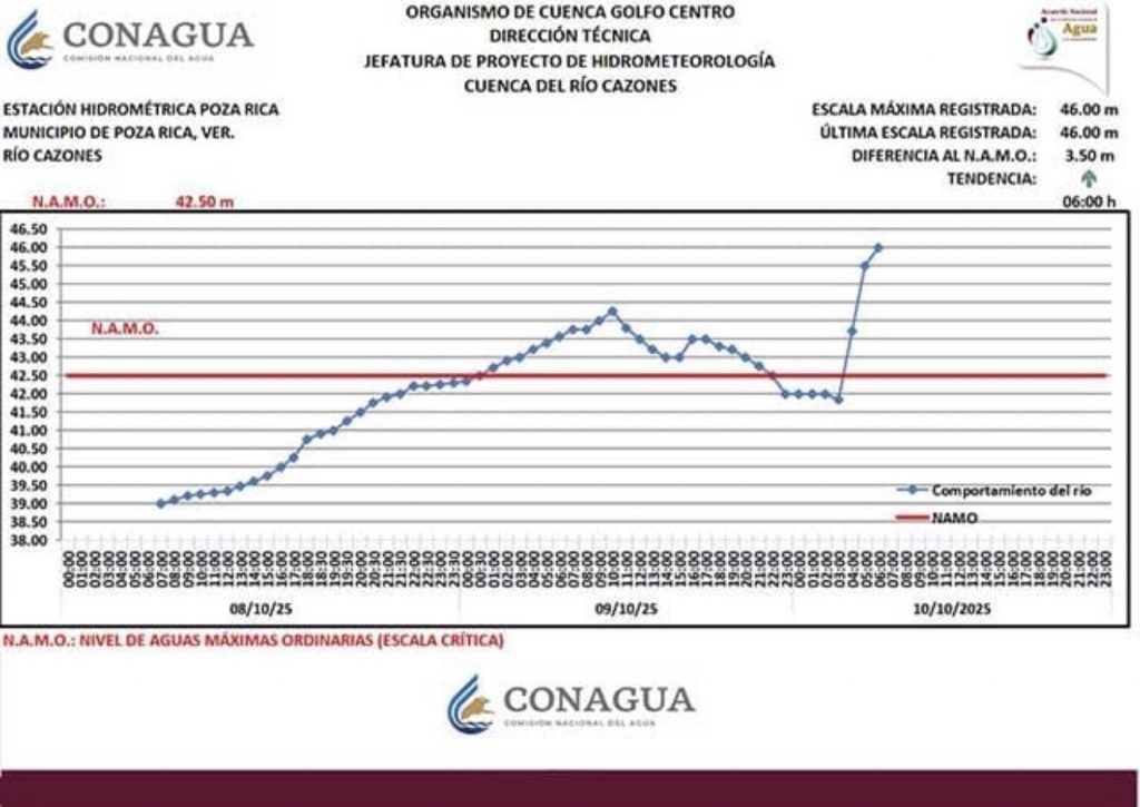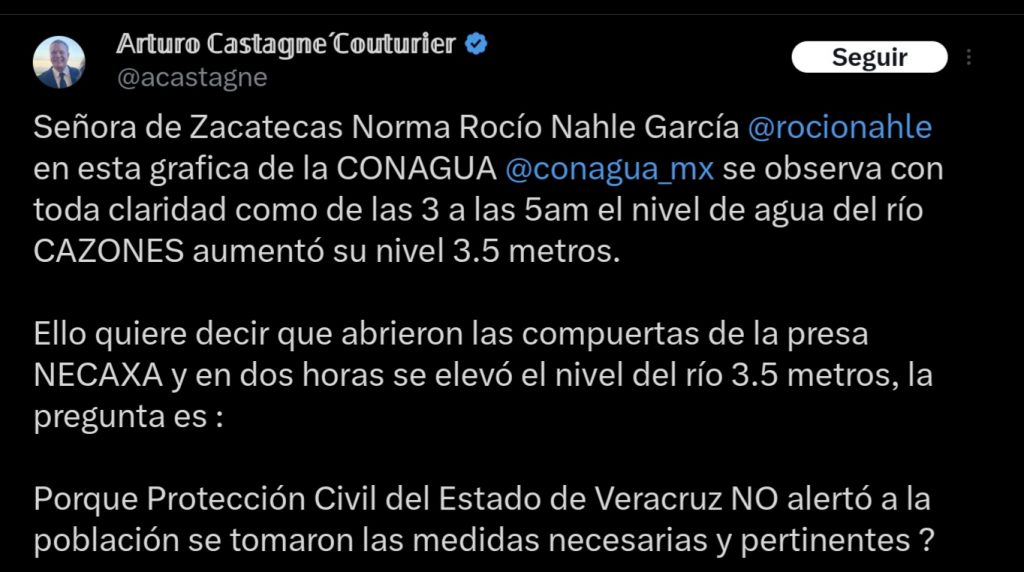 El empresario Arturo Castagné Couturier denunció a través de su red social un fuerte aumento en el nivel del río Cazones, que pasó a elevarse 3.5 metros entre las 3 y 5 de la mañana, según una gráfica de la CONAGUA compartida por la secretaria Norma Rocío Nahle García.