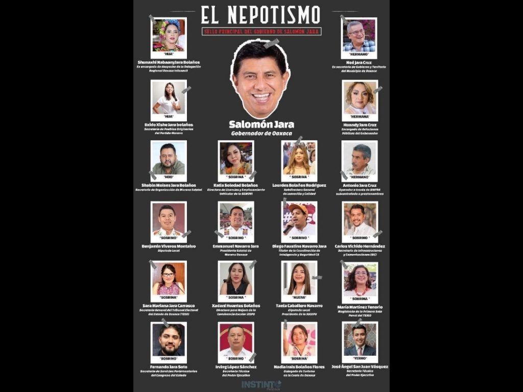La gráfica, titulada “El nepotismo: sello principal del gobierno de Salomón Jara”, identifica a hijos, hermanos, sobrinos, nueras y yernos del mandatario en posiciones dentro del Gobierno del Estado, Morena, el Congreso local, el Tribunal Electoral, el Poder Ejecutivo y organismos descentralizados.