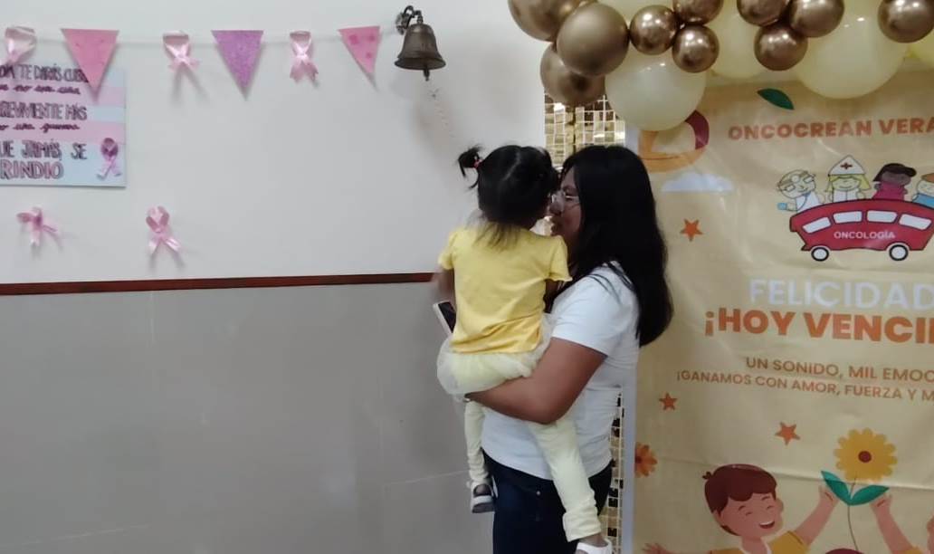 Asimismo, Luz Yaretzi una valiente guerrera de tan solo 2 años y 6 meses de edad tocó la campana acompañada de su mamá, la señora Sxunashi Sandoval, quien conmovida expresó su agradecimiento al personal IMSS.