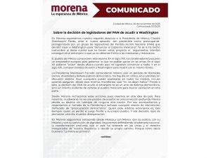 Según el documento, Morena expresa su respaldo absoluto a la presidenta Claudia Sheinbaum, a quien el bloque opositor pretende señalar ante instancias y actores políticos en Estados Unidos. Para el partido en el poder, este comportamiento responde a que “al no tener votos, proyecto ni argumentos”, los panistas “buscan fuera lo que no consiguen frente a las y los mexicanos”.