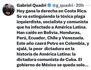 El exlegislador y excandidato presidencial Gabriel Quadri desató controversia en redes sociales tras publicar un mensaje en el que afirmó que “hoy gana la derecha en Costa Rica” y que se estaría extinguiendo lo que calificó como una “plaga izquierdista, socialista y comunista” en América Latina.