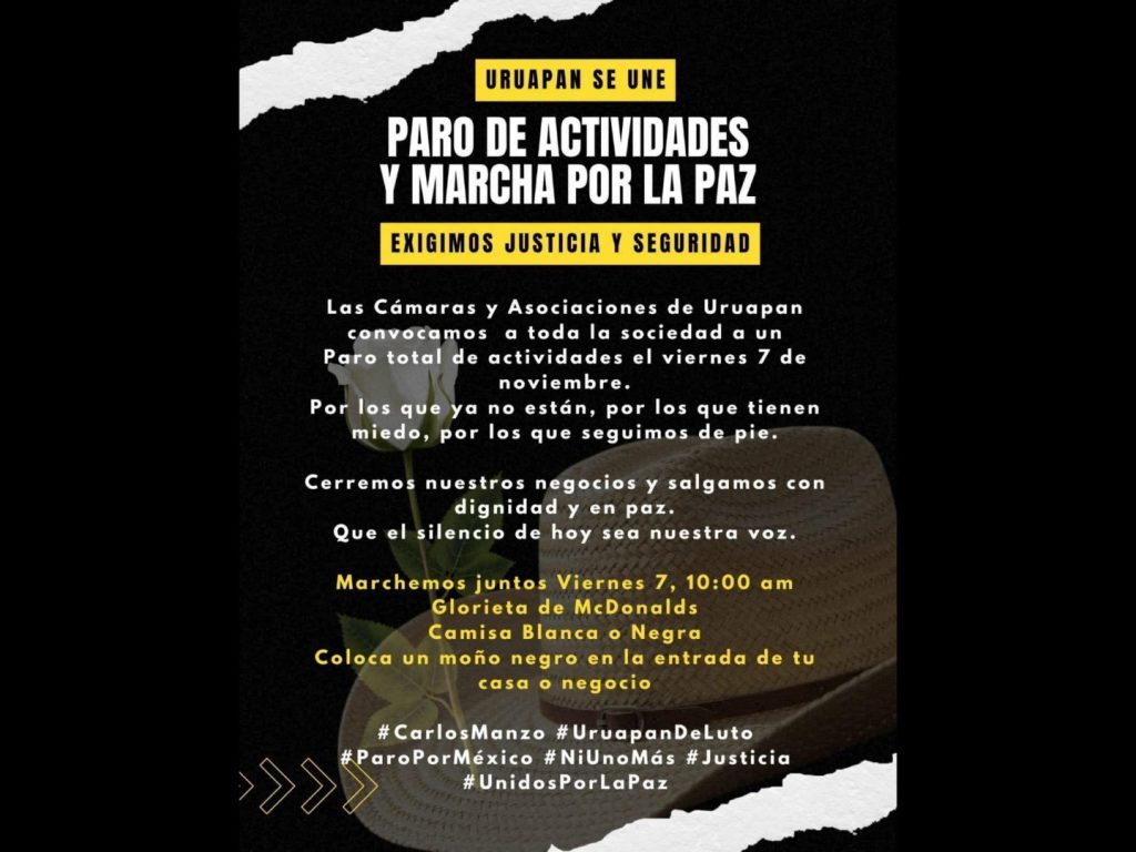 Tras el asesinato del alcalde de Uruapan, Carlos Alberto Manzo Rodríguez, cámaras empresariales, asociaciones civiles y ciudadanía convocaron a un paro total de actividades y una marcha por la paz y la justicia este viernes 7 de noviembre, a las 10:00 de la mañana, en la glorieta de McDonald’s.