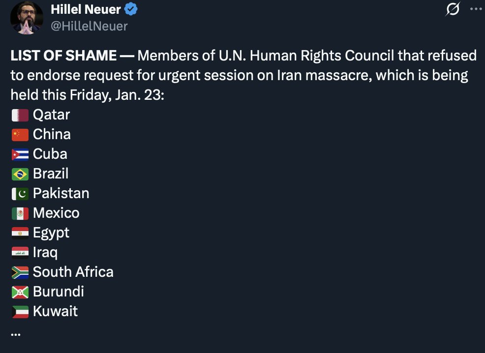 De acuerdo con una lista difundida por el director de la organización UN Watch, México figura junto a países como China, Cuba, Brasil, Pakistán, Qatar, Egipto, Irak, Sudáfrica, Burundi y Kuwait, todos ellos miembros del Consejo de Derechos Humanos de la ONU que rechazaron apoyar la solicitud de una sesión urgente sobre la represión y asesinatos cometidos por el régimen iraní contra opositores y disidentes.