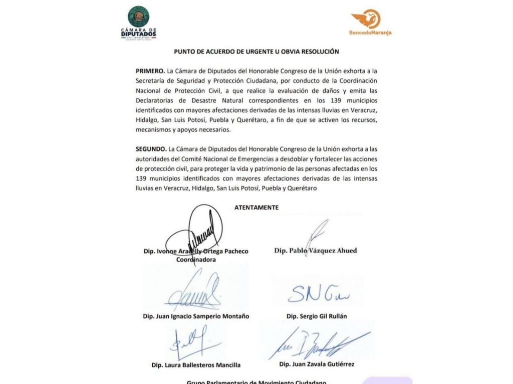 La Bancada Naranja presentó un acuerdo de urgente resolución para solicitar que se declare desastre natural en Veracruz, Hidalgo, San Luis Potosí, Puebla y Querétaro. La medida busca que los municipios afectados accedan a recursos de recuperación y reconstrucción tras los recientes daños ocasionados por fenómenos naturales.