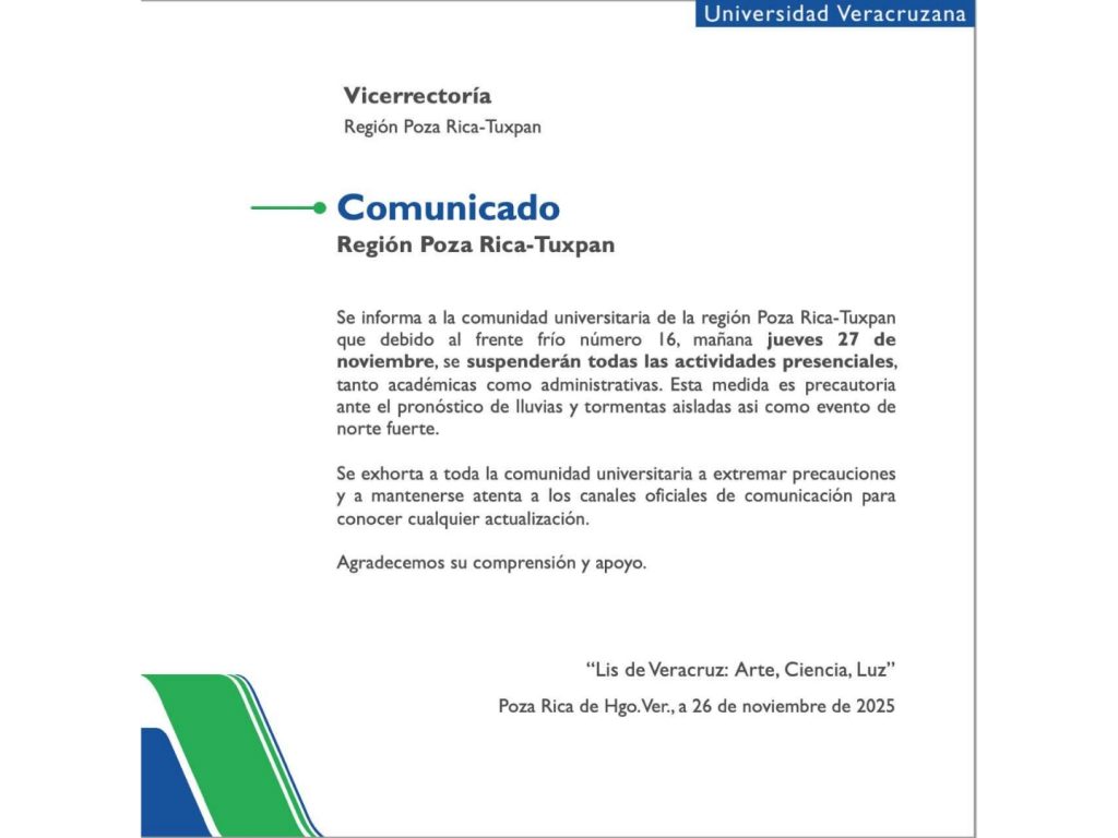 ​La Universidad Veracruzana (UV), Vicerrectoría Región Poza Rica-Tuxpan, ha emitido un comunicado urgente informando sobre la suspensión de todas las actividades presenciales, tanto académicas como administrativas, en la región.