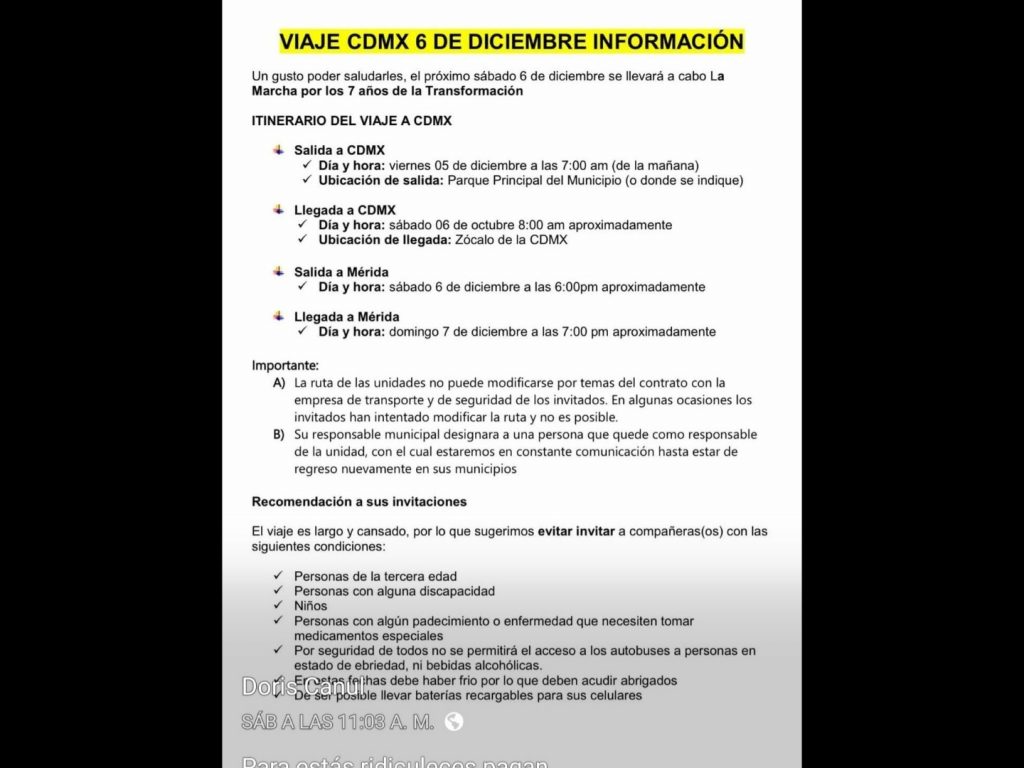 En redes sociales circula en Yucatán un documento titulado “Viaje CDMX 6 de diciembre — Información”, donde se detallan horarios, puntos de salida y recomendaciones para trasladar grupos a la capital con motivo de la “Marcha por los 7 años de la Transformación”, convocada para el 6 de diciembre.