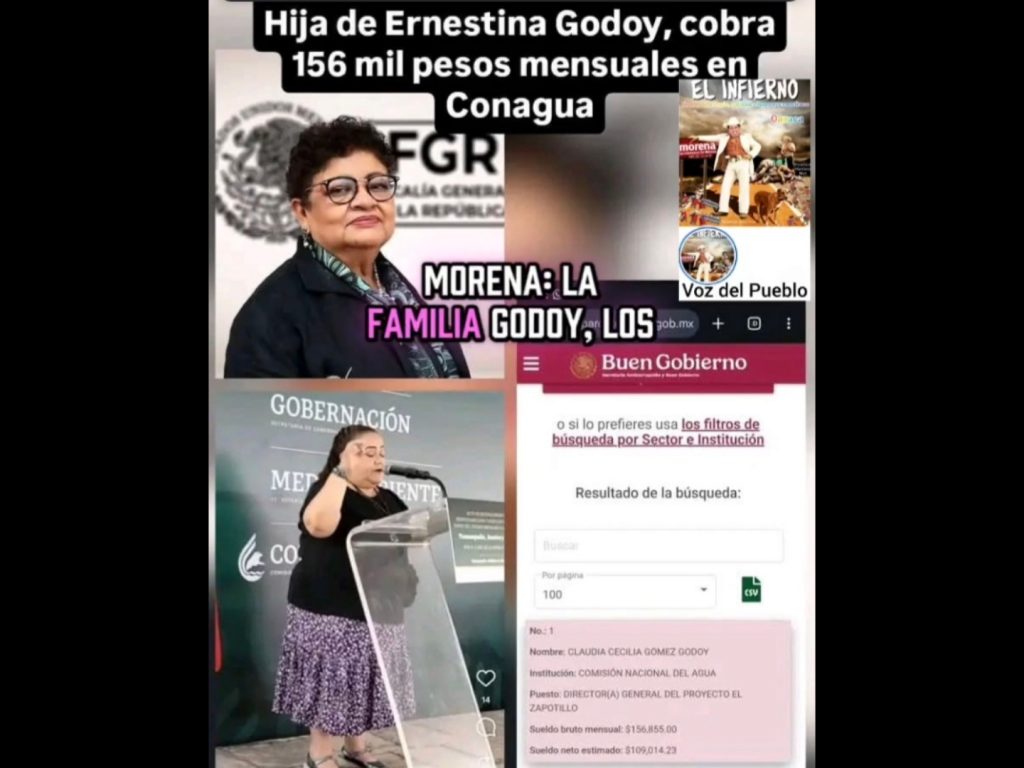 Entre los casos señalados se encuentra Claudia Cecilia Gómez Godoy, hija de la fiscal, quien percibe 156,865 pesos mensuales como directora general del Proyecto El Zapotillo. De igual manera, Mariana Gómez Godoy, también hija de Godoy, recibe 82,013 pesos mensuales en un cargo de dirección dentro de la administración capitalina.