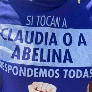 En redes sociales circularon imágenes de mujeres portando playeras con la leyenda: “Si tocan a Claudia o a Abelina, respondemos todas”, lo que generó cuestionamientos sobre la utilización de una jornada de protesta feminista para promoción política.