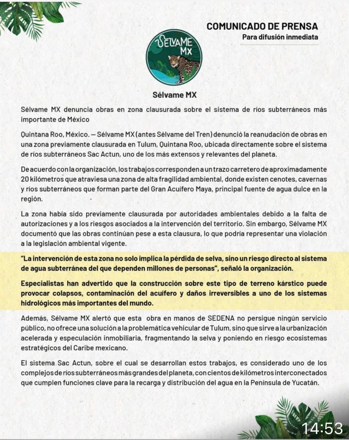 Sélvame MX advirtió que la intervención representa riesgo directo para el sistema de agua subterránea del que dependen millones de personas, además de posibles colapsos, contaminación del acuífero y daños irreversibles en uno de los sistemas hidrológicos más relevantes del mundo debido a la naturaleza kárstica del terreno.