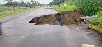 Un hombre que circulaba a bordo de un mototriciclo eléctrico cayó a una zanja formada a un costado de la carretera en Antón Lizardo, a pocos metros del libramiento y de las instalaciones de la Escuela Naval, luego de que parte del pavimento se desplomara presuntamente a consecuencia de las fuertes lluvias registradas este viernes.