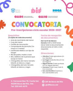 El DIF Municipal de Boca del Río anunció la apertura de las preinscripciones para los Centros de Asistencia Infantil (CADI) y los Centros de Asistencia Infantil Comunitaria (CAIC), correspondientes al ciclo escolar 2026–2027.