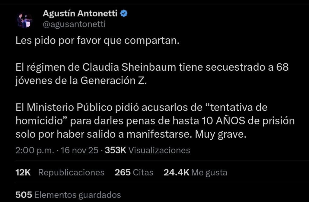 El activista internacional Agustín Antonetti denunció en sus redes sociales que 68 jóvenes de la Generación Z permanecen detenidos por el gobierno de Claudia Sheinbaum, a quienes —según afirmó— el régimen pretende imputarles el delito de “tentativa de homicidio” pese a que únicamente participaron en una manifestación.