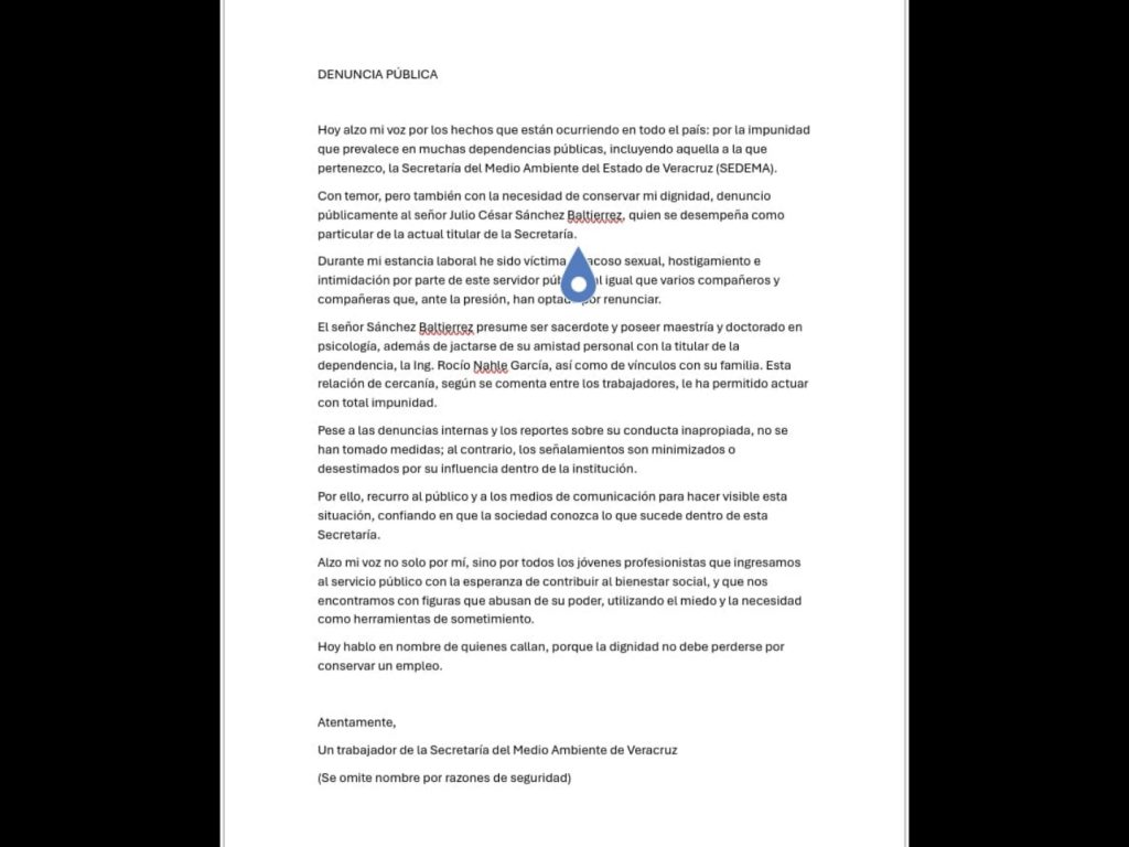 “Alzo mi voz no solo por mí, sino por todos los jóvenes profesionistas que ingresamos al servicio público con la esperanza de contribuir al bienestar social, y que nos encontramos con figuras que abusan de su poder, utilizando el miedo y la necesidad como herramientas de sometimiento. Hoy hablo en nombre de quienes callan, porque la dignidad no debe perderse por conservar un empleo.”