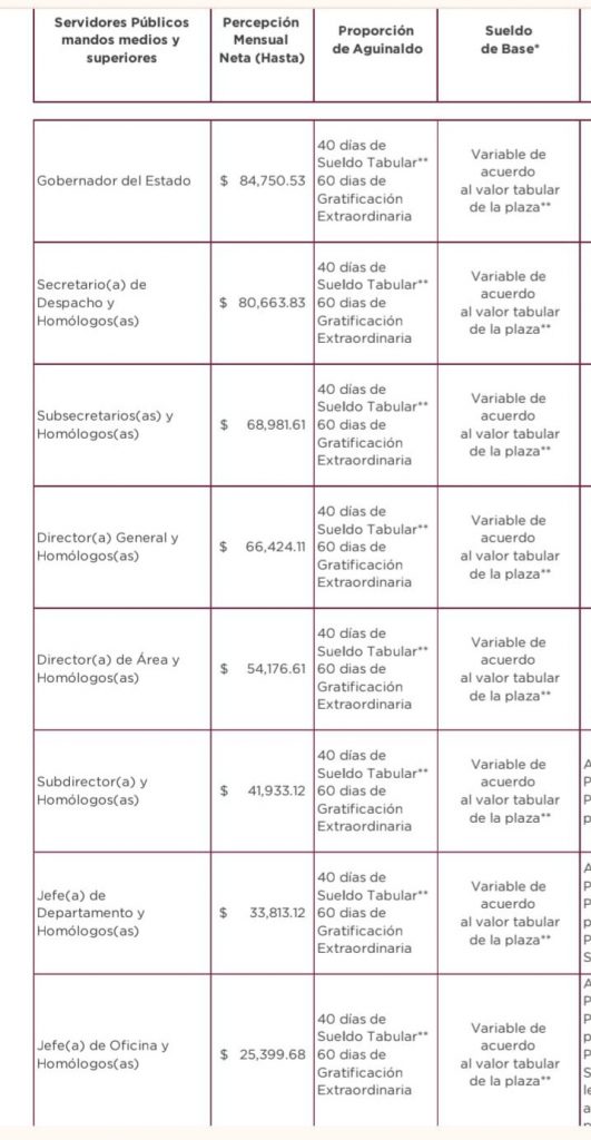 • Directores de área y homólogos: 54 mil 176 pesos con 61 centavos.