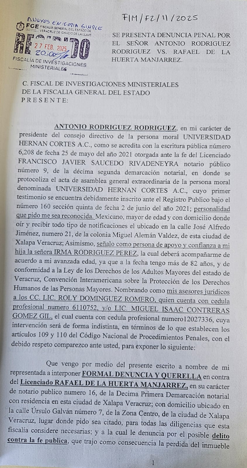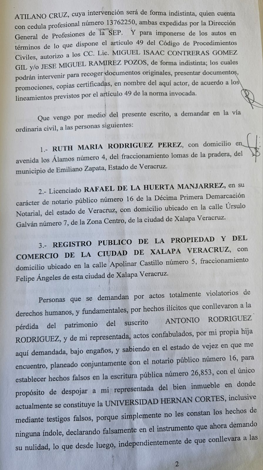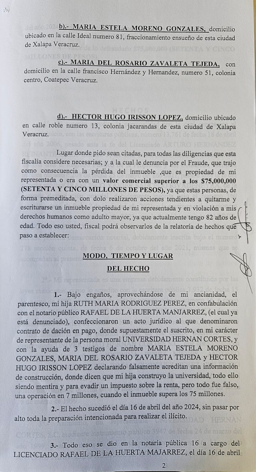 En entrevista, Antonio Rodríguez explicó que a inicios de año, con engaños por parte de su hija fue llevado a las oficinas del Notario Rafael de la Huerta Manjarrez, para firmar lo que sería la cesión de derechos.